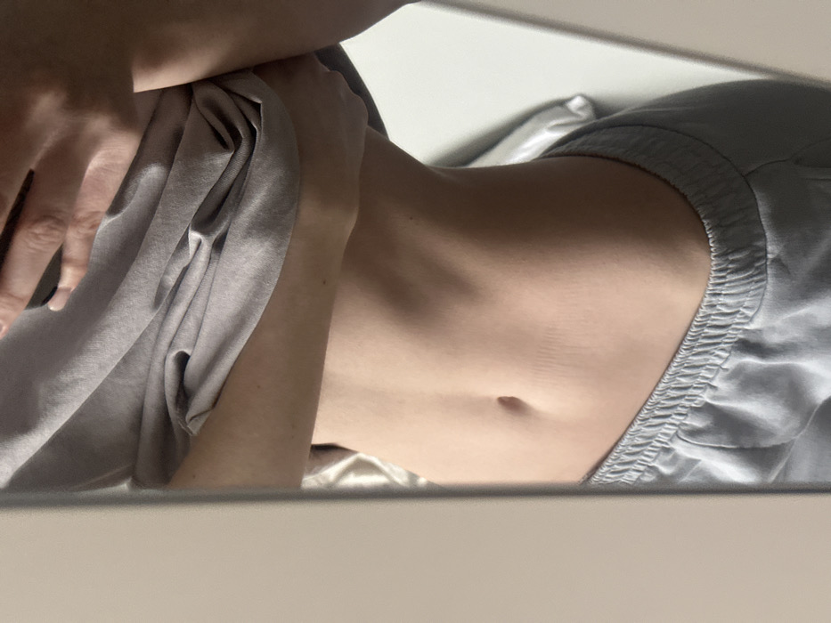 The image displays a close-up, waist-up mirror reflection of a human midsection