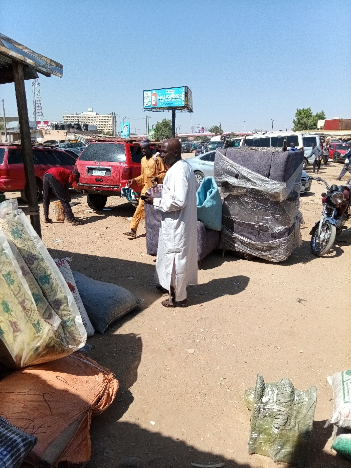 This image depicts a bustling outdoor commercial or transport area in Giginyu, Nigeria, under a clear blue sky