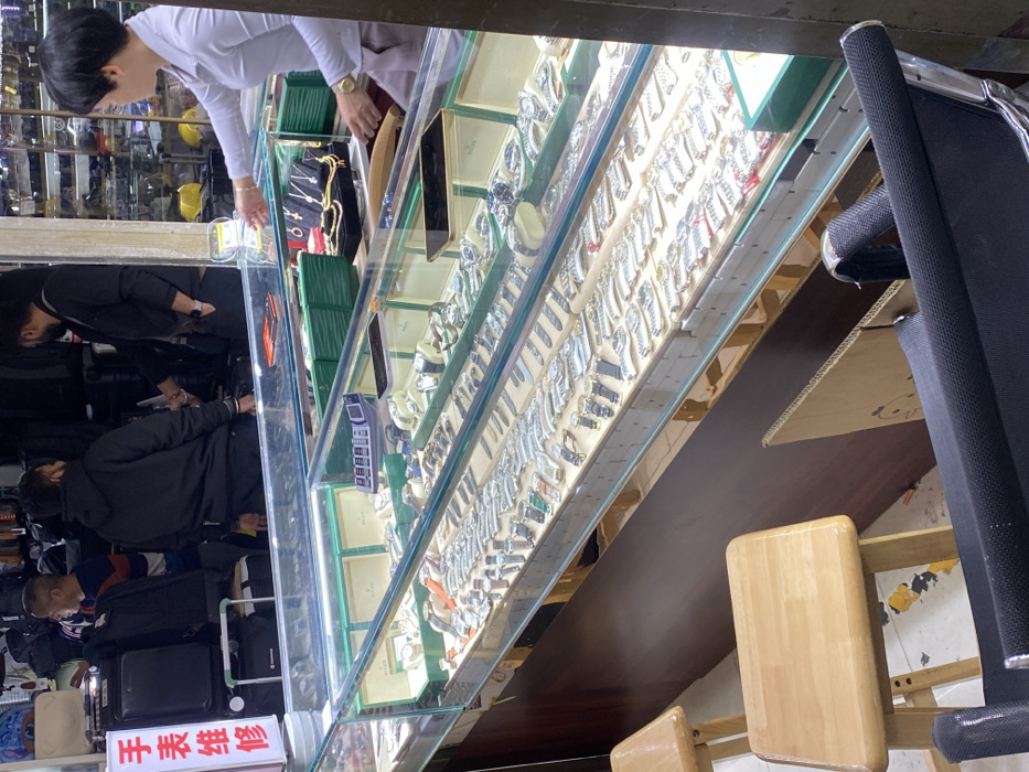 The image depicts an indoor market or retail establishment, specifically a watch and jewelry stall, located within the Yuexiu District of China