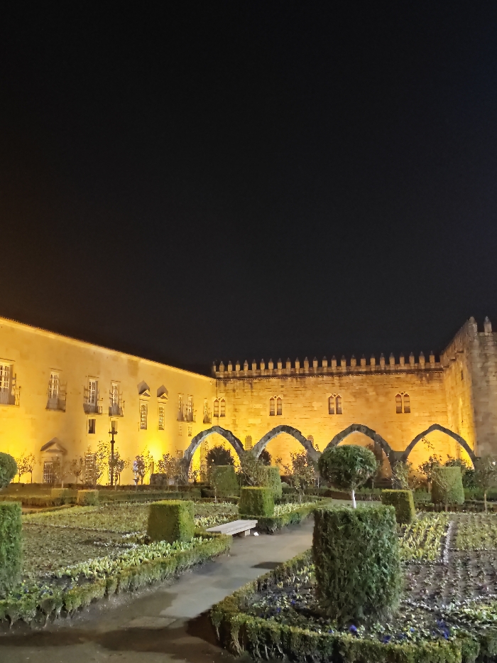 A nighttime view showcases a large, illuminated stone building with a garden in the foreground