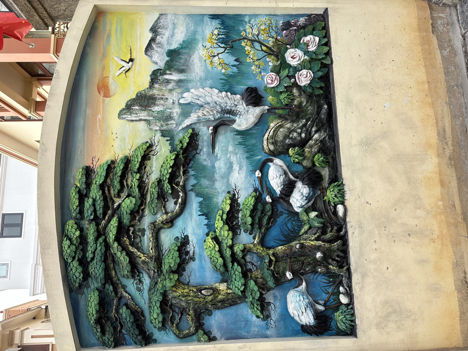A colorful, three-dimensional bas-relief artwork is affixed to a cream-colored, textured stucco wall in Ha Long Ward, Vietnam