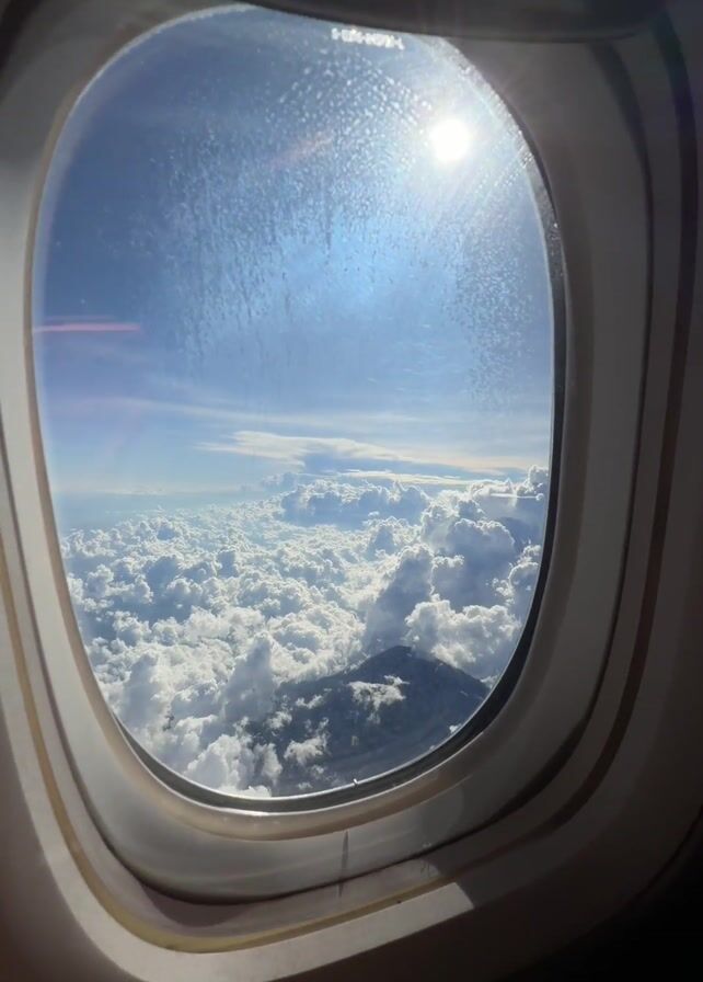 view from an airplane window. The sky is blue with fluffy white clouds. The sun is shining brightly. A dark mountain peak is visible poking through the clouds. A voice speaking in a foreign language can be heard. The window itself appears slightly dirty.