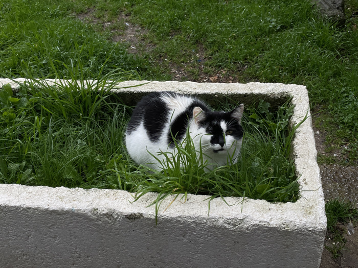 - "An eye-level outdoor photograph captures a bicolored domestic short-haired cat situated within a rectangular concrete planter filled with dense green grass" by FM-UjYe32, licensed under CC BY 4.0