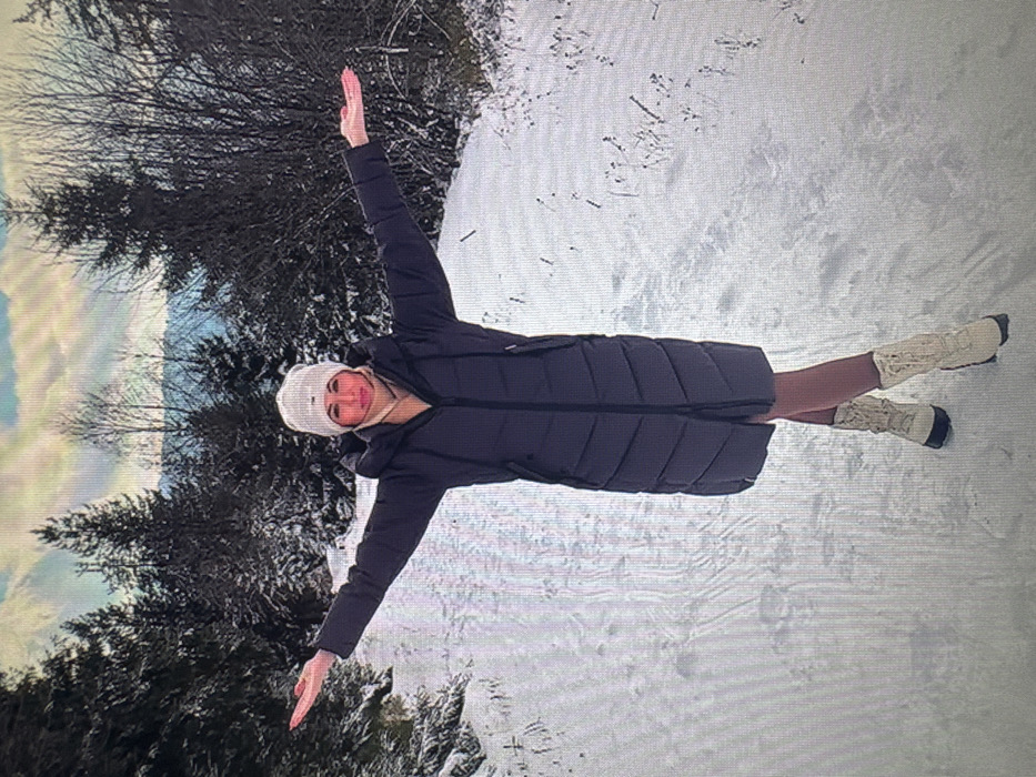 The image displays a female individual standing centrally on a snow-covered path within a dense winter forest. The subject is wearing a light-colored beanie, a high-collared light-colored top under a dark gray long quilted puffer coat, brown leggings, and light-colored lace-up winter boots with dark soles. Her arms are extended horizontally outwards, palms open and upward, and her legs are crossed at the ankles. The surrounding environment consists of snow-laden coniferous trees on the left and a mix of snow-dusted coniferous and bare deciduous trees on the right, forming a natural, wooded landscape. The path beneath her is also covered in fresh snow with some tracks. In the background, distant snow-covered hills or mountains are visible under a partly cloudy sky with patches of blue. No specific urban landmarks or features identifying the location as within the city of Nuremberg, Germany, are present; the scene depicts a natural, rural, forested area.