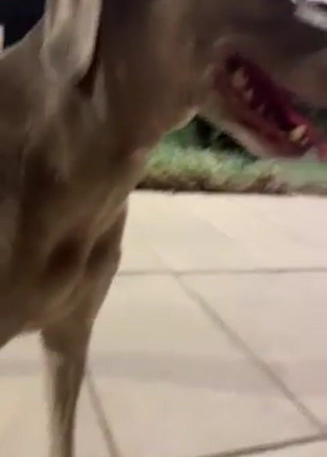 A dog with short, gray fur stands on a patio paved with square tiles. The dog's head is visible, showing its ears, eyes, nose, and open mouth with teeth visible. The dog looks to its left, and then briefly faces the camera. Behind the patio there are green bushes and a dark building with lights. The camera briefly focuses on the dog's back before it moves out of frame.
