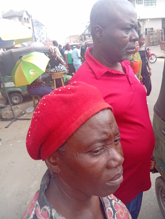 The image depicts a street scene in Ura Nta Umuarandu, Nigeria, characteristic of an urban market or commercial area. In the immediate foreground, a dark-skinned woman, facing slightly right and downward, wears a red beret with small reflective accents and a multicolored patterned top. Behind her, a dark-skinned man with a shaved head and a short grey beard wears a red polo shirt, looking to his right with a neutral expression. To the left, a green three-wheeled motorized rickshaw is parked, beside which a person sits on a wooden stool under a prominent green and yellow striped umbrella. The background features several blurred individuals, including a woman in a patterned dress and another in a dark dress, along with multi-story buildings, one with white-framed windows. A red motorcycle is visible further down the street on the right. The ground is a paved surface, and the scene is illuminated by natural daylight.