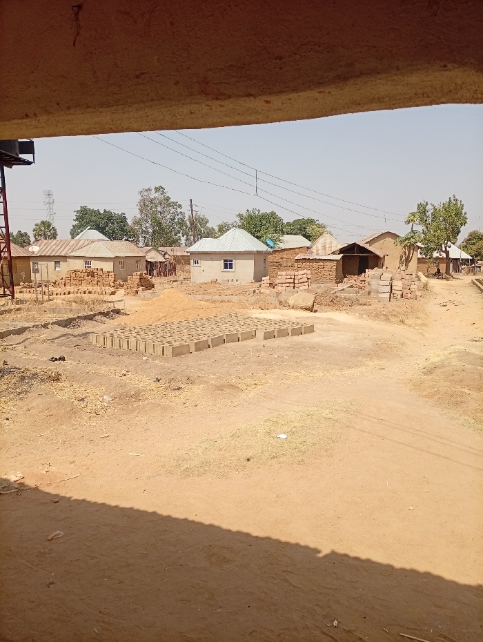 The image depicts an outdoor scene in Barikin Gidar Kanat, Nigeria, characterized by dry, light brown earth and sparse dry vegetation under a clear, pale blue sky