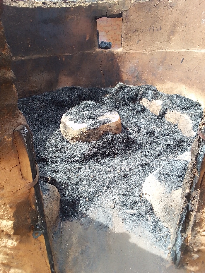 interior of a small, rectangular room with mud brick walls and a dirt floor. The room is covered in black ash and debris, indicating that it has recently been burned. There is a small, rectangular window on the left wall, which is boarded up. A black plastic bag is visible through the window. In the center of the room, there is a large, round, rock-like object, partially covered in ash. The room is located at the coordinates 9.803 latitude and 8.646 longitude, which places it in the city of Kwal, Nigeria. There are no people present in the image.