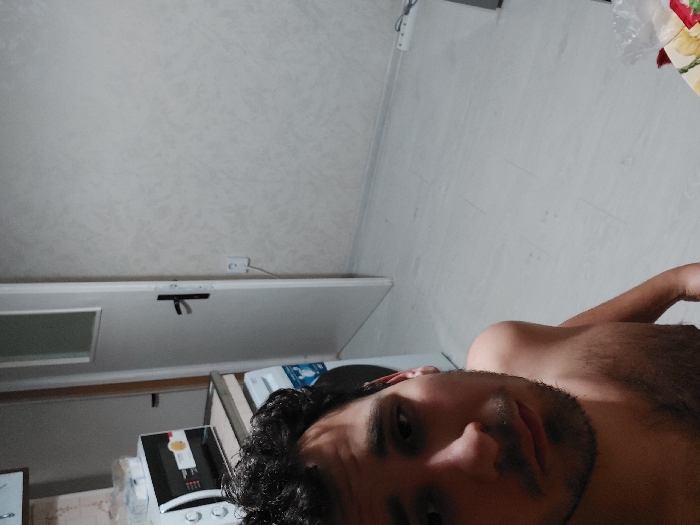 The image depicts an indoor scene within a residential or utility space in Gorna Oryahovitsa, Bulgaria. A male subject is positioned in the lower-left foreground, capturing a self-portrait. He presents with dark, curly hair and facial stubble, appearing bare-chested, and is looking directly into the camera. The background reveals a room with a light-grey, wood-effect laminate floor. Along the left side, a white microwave oven with a dark glass door is visible on a light-colored countertop. Items in clear plastic packaging are stacked atop the microwave, and a white appliance, possibly a washing machine or dishwasher, is situated beneath the counter. A partial view of a white wall-mounted cabinet is above the microwave. In the mid-ground, slightly right of center, a white interior door with a black handle is ajar, exposing a glimpse of another room or hallway. The door features a translucent rectangular panel in its upper section. An electrical wall outlet with a white cord plugged into it is visible on the wall adjacent to the door. The wall to the right of the door exhibits a subtle, light-colored textured pattern. In the lower-right corner, a section of a table is visible, draped with a floral-patterned tablecloth. A clear plastic bag containing red and white items rests on this table. Against the far right wall, a white multi-plug extension cord is visible on the floor, with several cables connected. The room is illuminated by overhead artificial light sources, casting soft shadows.