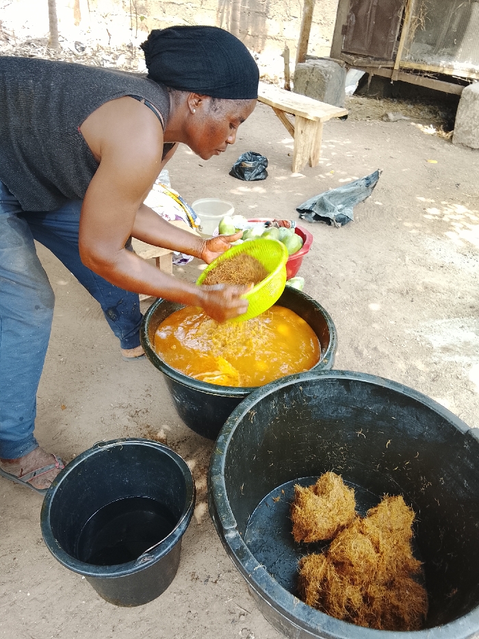 An outdoor scene in Akwanga, Nigeria, depicts a female subject engaged in food or raw material processing on a dry, sandy ground surface. The subject, wearing a dark sleeveless top, dark headwrap, blue jeans, and sandals, is bent over a large, round black plastic basin filled with a viscous, orange-yellow liquid. Her forearms are visibly stained with a similar orange substance. She holds a bright green plastic colander containing a quantity of fine, brown granular material, which she is actively pouring or sifting into the liquid, causing ripples and dispersion. To the subject's right, a second large, oval black plastic basin contains several clumps of light brown, fibrous material. To her left, a smaller black plastic bucket holds clear water. In the mid-ground, behind the main processing basin, a red plastic basin contains multiple green, round fruits. The background includes a simple wooden bench and a rudimentary structure, possibly a shed or animal enclosure, constructed from wood and metal sheets, elevated on stone blocks, with straw or hay visible beneath it. A black plastic bag and other dark debris are present on the ground. The scene is illuminated by bright daylight.