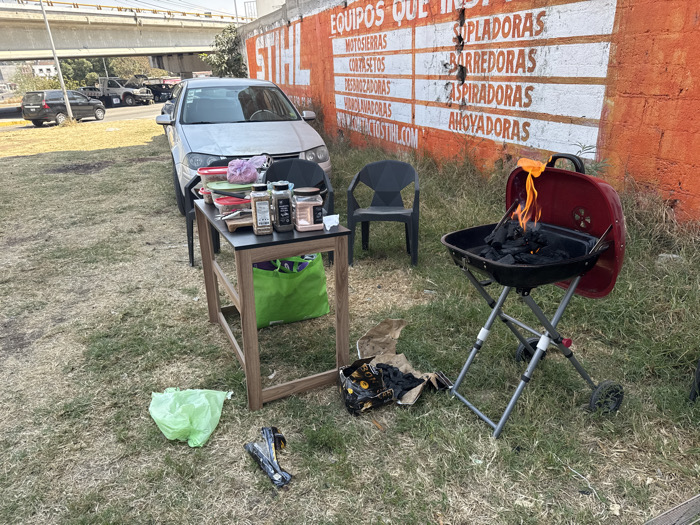 The image displays an outdoor scene in San Andrés Cholula, Mexico, characterized by an impromptu barbecue setup on a dry, sparse grassy area. In the foreground, a red, portable kettle-style charcoal grill stands on a metal folding frame with wheels, containing actively burning charcoal and visible flames; metal tongs rest on its edge. Adjacent to the grill on the left, a dark-topped, light-wood-framed portable table is set up, holding several food containers, a cutting board, and three distinct spice or seasoning jars. A bright green reusable shopping bag is positioned beneath the table. To the left of the table, a crumpled green plastic bag rests on the grass. An open cardboard bag, consistent with charcoal packaging, is on the ground near the grill. A silver Volkswagen Golf sedan is parked on the grass behind the table, partially obscured. A single dark plastic chair is visible between the table and the grill. The background features a tall orange concrete wall with white painted Spanish text advertising "STIHL" equipment, including "MOTOSIERRAS," "SOPLADORAS," "BARREDORAS," "ASPIRADORAS," and "AHOYADORAS," along with a website address. Beyond the parked vehicle and wall, a multi-lane roadway with moving vehicles is visible, surmounted by a large concrete overpass structure, under a clear, bright sky. No individuals are present in the immediate scene.