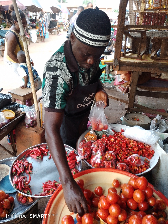 A man in a cap and apron labeled "Tobe Chinelafu" is selling produce at an outdoor market. He stands behind large bowls filled with red tomatoes and peppers. He holds a plastic bag and selects tomatoes to fill it. Other people are visible in the background, suggesting a busy marketplace setting. The bowls display the colorful produce prominently.