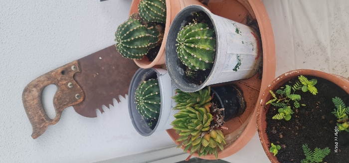 The scene depicts an outdoor or semi-outdoor arrangement of potted plants and a tool against a textured white wall. In the upper half, an old, heavily rusted hand saw with a weathered wooden handle leans against the wall, its serrated blade pointing leftward. Below this, a large, round, reddish-brown terracotta tray serves as a base for multiple plant pots. On the left side of the tray, a small black plastic pot contains a clustered green succulent plant with broad, fleshy leaves, some displaying yellowed or dried lower foliage. Adjacent to it on the tray, a dirty white plastic container, appearing repurposed, holds a globular green cactus characterized by distinct vertical ribs and clusters of white or yellowish spines. Further back on the tray, a gray plastic bucket, also seemingly repurposed, contains another globular green cactus. Behind these, a standard terracotta pot holds two similar globular green cacti. In the lower-left foreground, a separate reddish-brown terracotta pot is filled with dark soil from which numerous small seedlings with delicate, light green, fern-like leaves are growing. A white watermark, "rosa.h.mejo", is visible on the soil within this foreground pot. The surface supporting the foreground pot and the main terracotta tray is light-colored. No human subjects are present. The specific location in Kifisia, Greece, is not identifiable from the visual content of the image.