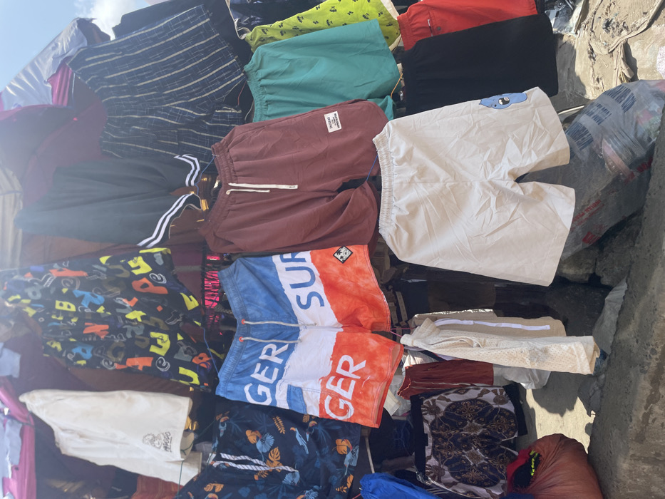 This image displays an outdoor merchandise stall showcasing various men's shorts and swim trunks in Satellite Town, Nigeria
