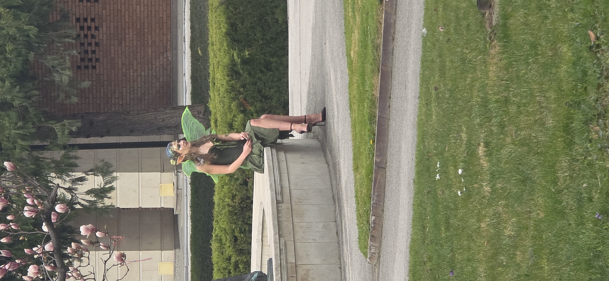 The image depicts an outdoor scene in a public park or square within the city of Plovdiv, Bulgaria, characterized by green spaces and architectural elements. In the foreground and mid-ground, a young female individual is seated on the raised, light-colored stone rim of a circular or semi-circular structure, possibly a fountain or large planter. She is oriented slightly to her left, looking towards her right, away from the camera. Her attire includes a dark green, fitted dress and large, translucent green fairy wings affixed to her back. Her head is adorned with a decorative headband featuring leafy or floral motifs, and she wears pointed ear prosthetics. Her face shows visible makeup, including eyeliner. Her feet are clad in black high-heeled shoes with ankle straps. Her hands are clasped in her lap, holding an indistinct dark, rectangular object. The immediate environment around the stone structure features manicured green hedges behind the subject. A light gray paved path or road runs in the mid-ground, with a grass verge in the foreground showing patches of green and some small white and purple flowers. The background consists of several trees and buildings. To the upper left, a deciduous tree with numerous light pink blossoms (likely a magnolia) extends branches into the frame. Behind the hedges, a large evergreen tree with a dark trunk stands prominently. Further back, two building facades are visible: one with a light-colored, possibly concrete or stone, appearance featuring several rectangular recessed panels or windows; and another to the right, constructed of reddish-brown brickwork with a patterned vent or decorative section. The overall lighting suggests an overcast or diffused sky.