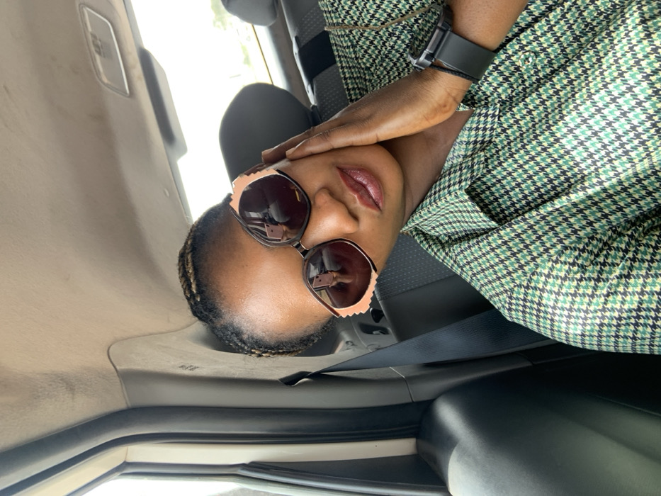 A female individual is depicted in a close-up, self-portrait photograph captured within the interior of a vehicle. She has a dark complexion and her hair is styled in braids. She is wearing large sunglasses with reflective, dark-tinted lenses and a distinct two-toned frame featuring a dark primary color and a lighter, possibly peach, upper edge. Her lips are enhanced with a glossy, reddish-brown cosmetic. She is dressed in a collared shirt characterized by a green, black, and off-white small-scale houndstooth pattern. A black digital smartwatch with a square face is present on her left wrist. Her left hand is raised, with fingers gently touching her left cheek and jawline. A dark seatbelt is visible across her chest. The vehicle's interior features a light-colored headliner and dark-colored, possibly fabric-upholstered, seats with a subtle pattern. Blurred exterior elements are visible through the vehicle's windows, but no distinct landmarks are identifiable. The specific location within the city of Abuja, Nigeria, cannot be determined from the visual information provided in this image.