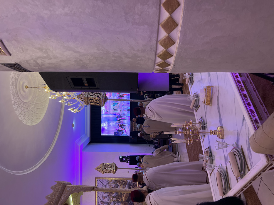An indoor banquet features a long, marble-topped table set with elegant tableware. People in white robes and red hats line the table, facing a large screen displaying moving images. A chandelier hangs overhead, and the ceiling is adorned with intricate patterns and decorative trim. A sound system component is visible near the chandelier. The scene is illuminated with purple uplighting, creating a formal and festive ambiance.