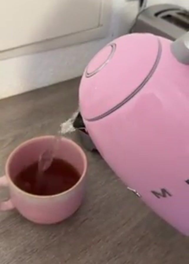 A pink Smeg electric kettle pours water into a pink mug filled with a dark brown liquid