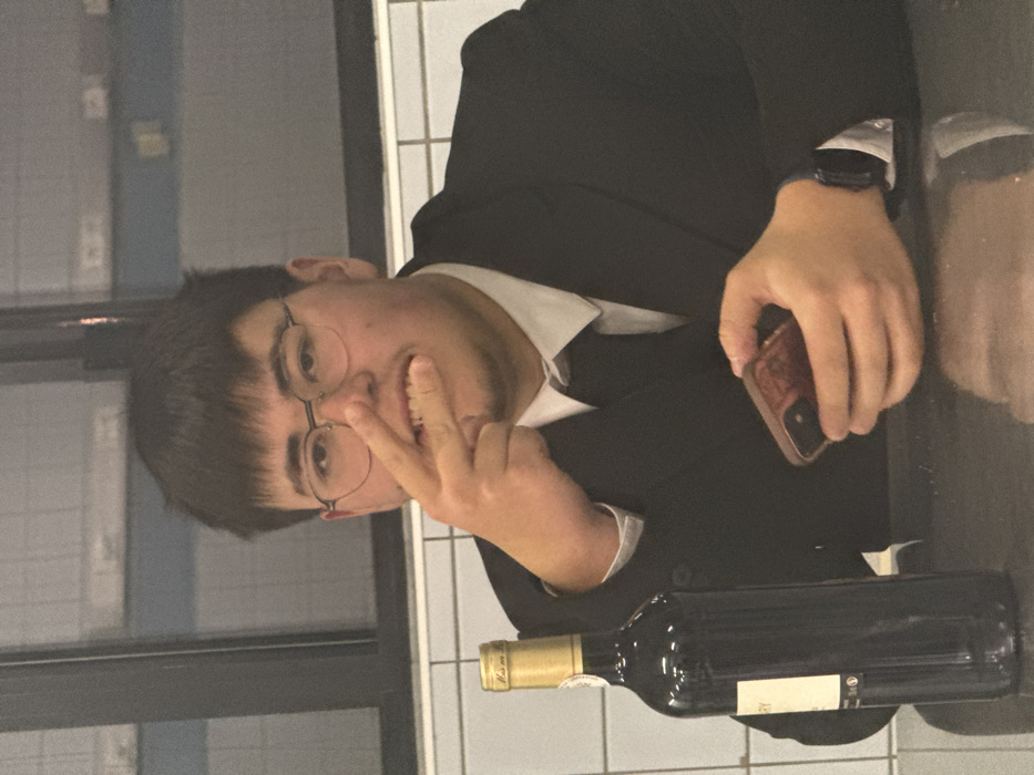 A young man in a black suit and round glasses smiles, holding up two fingers near his face. He's also holding a brown phone in his right hand and wearing a smartwatch on his left wrist. A bottle of red wine lies horizontally on the surface in front of him, with a gold label and dark liquid visible. The background includes what appears to be a tiled wall or paneling.