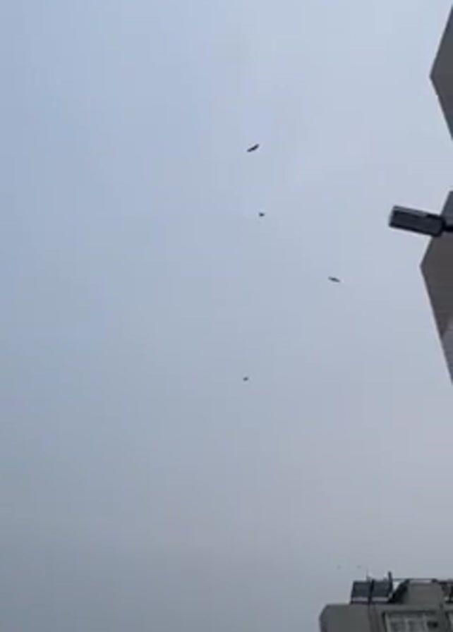 cloudy sky over an urban environment. Several birds are flying in the sky. The camera pans slightly, revealing buildings, a street lamp, and trees in the background. The sky appears overcast and grey.