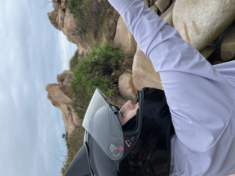 A person wearing a shiny black motorcycle helmet and light purple long-sleeved shirt is angled toward the camera, their face visible through the clear visor. The backdrop features large, beige rocks and sparse greenery, resembling a coastal landscape. Above, the sky is overcast. The composition is rotated, with the horizon line running vertically.