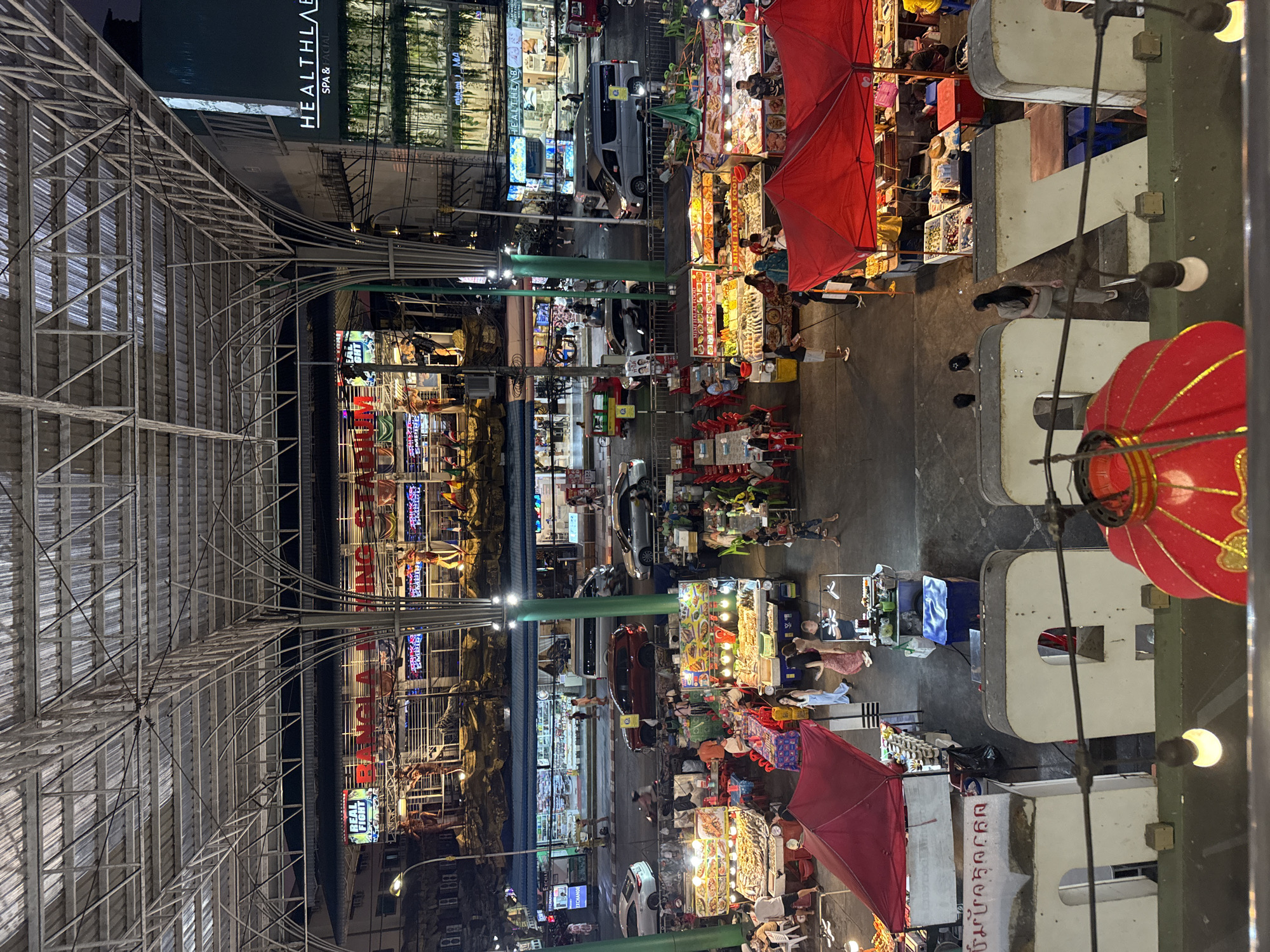 An elevated, nighttime view captures a bustling open-air market and street scene in Patong, Thailand, specifically within the vicinity of the Bangla Boxing Stadium, visible across the street. The scene is illuminated by numerous artificial light sources, including overhead string lights, stall lighting, and illuminated building signs. Dominating the upper section is a large, complex metal truss roof structure, appearing to be an awning or part of a building, supported by multi-columned pillars. Below this structure, a lively market occupies a paved area. Numerous vendors operate under individual red tarpaulin awnings, displaying a variety of items, primarily fresh seafood, prepared foods, and produce. Some stalls are labeled "MIMI HALAL FOOD." Customers and vendors interact within the market, with several people seated at plastic tables (red, blue, green) arranged for dining. Beyond the market, a street accommodates vehicular traffic, including cars (e.g., a dark red SUV, silver sedan, white passenger van) and motorcycles. Pedestrians are visible on sidewalks and crossing the street. Across the street, multi-story buildings house various businesses. Prominently displayed is an illuminated sign for "BANGLA BOXING STADIUM" featuring "REAL FIGHT" signage and large, anthropomorphic figures on its facade. Another building sign for "HEALTHLAB SPA & FACIAL" is visible on the right. In the immediate foreground, large, white, block letters, approximately waist-height to an adult, spell out "PATONG" on what appears to be a lower roof or platform. A decorative red lantern with gold accents hangs in the upper right foreground, obscuring part of the letter 'G'. Several individuals are present on this platform near the letters.