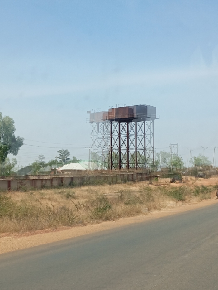The image captures an outdoor scene in Agingi Zion, Nigeria, under a clear, light blue sky. In the mid-ground, a large, elevated water tank stands. The tank's rectangular reservoir component is dark brown and appears rusted. It is supported by a tall, intricate latticework metal frame, also dark brown. A low, light brown concrete retaining wall runs horizontally across the mid-ground, situated below the water tank. Between this wall and the foreground, the ground is covered with dry, yellowish-brown grass and sparse green vegetation. In the immediate foreground, a two-lane paved road, dark grey in color, traverses diagonally from the lower left towards the middle right of the frame, with a reddish-brown dirt shoulder visible on its right side. No individuals, specific actions, or interactions are discernible. Distant green trees are visible to the left of the water tank, beyond the concrete wall.