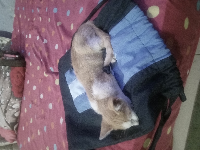 - "In an indoor setting within Tumfure, Nigeria, a small, light brown and white domestic kitten is observed sleeping on a dark-colored fabric item with a central blue panel" by FM-uD18w2, licensed under CC BY 4.0