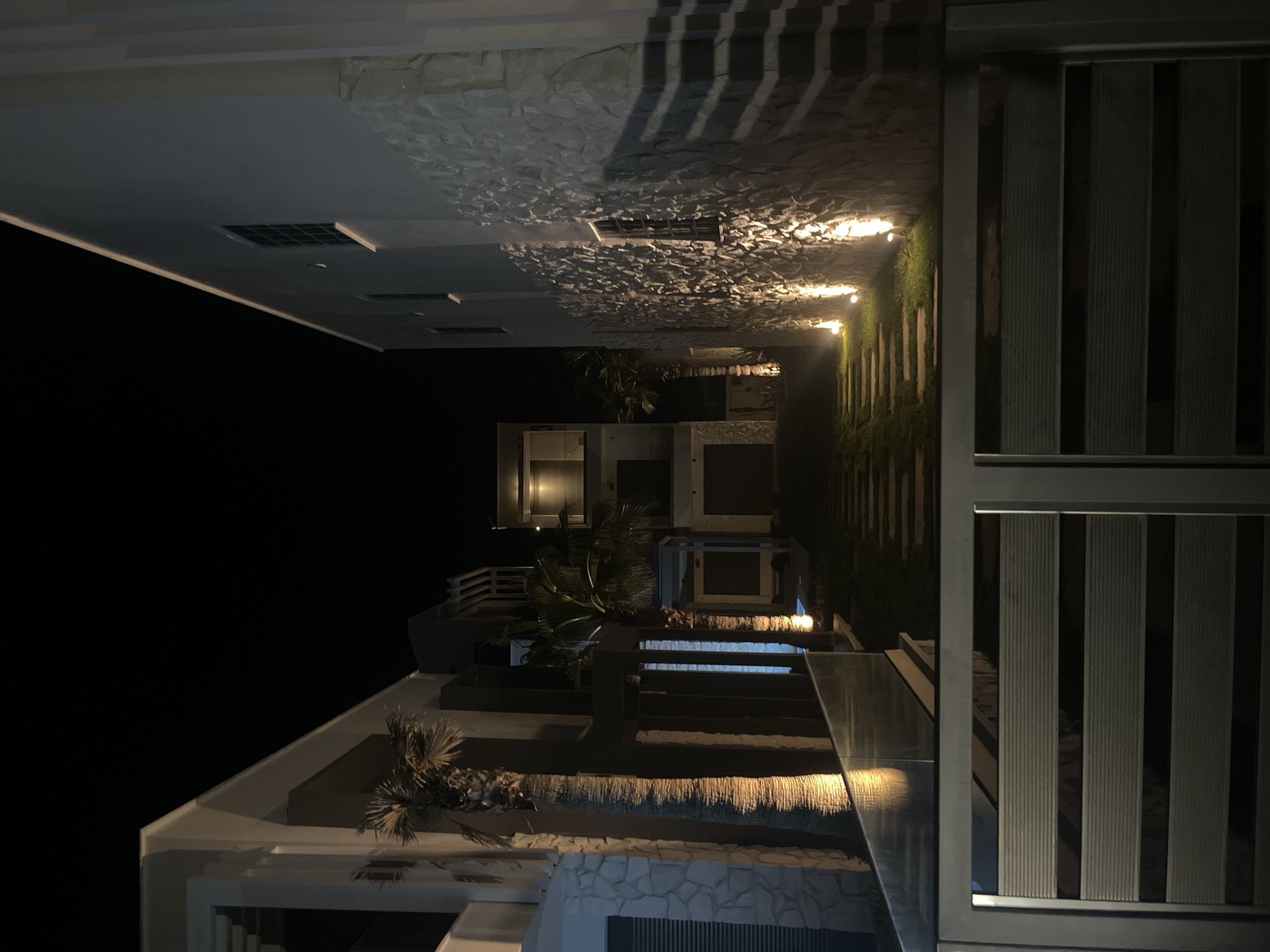 The image depicts an architectural scene at night in Ofrynio Beach, Greece. Multiple levels of modern buildings are visible, constructed with white walls and stone accents. Palm trees are positioned near the buildings. A pathway illuminated by evenly spaced lights runs between the structures. A dark metal gate with vertical slats is present on the right.