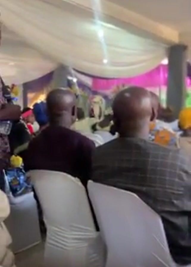 The camera faces away from people sitting in white chairs at an event in a hall. The hall is decorated with white, purple, and yellow fabric. People of various skin tones are visible in the audience. A bald man in a brown checkered suit sits in the front row. A woman with long braids, wearing a white top, sits next to him. An African woman in a blue patterned dress and head wrap sits to her right. The room is brightly lit. Someone is singing.