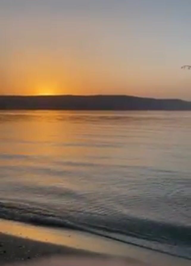 woman fishing on a beach at sunset. The sun is setting over a body of water, with a strip of land visible in the distance. The woman is wearing a blue bikini top and black shorts. She is holding a fishing rod and reeling in a small fish. The water is calm and reflects the colors of the sunset. The beach is sandy with some small stones.