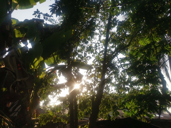 The image depicts a sunlit outdoor environment in Otolokpo, Nigeria, dominated by dense tropical foliage. The sun is visible in the upper-middle left, producing a distinct starburst effect and strong backlighting. Large, broad green leaves, consistent with banana plants, occupy the left foreground, casting significant shadows. Multiple trees with smaller green leaves are silhouetted against a bright, clear sky, spanning the central and right portions of the frame. Palm fronds are faintly visible on the far right. Portions of corrugated metal rooftops are discernible below the tree line in the lower-middle and right sections of the image, indicating proximate structures. No individuals, specific actions, or interactions are present.