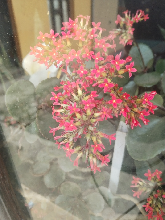 Clusters of bright pink Kalanchoe flowers dominate the image, contrasting with their green buds. Round, grey-green leaves provide a muted background. The photo is taken through a window, causing reflections and a somewhat blurred effect. A partial white flower and window frame are also visible. The flowers are the primary focus, adding vibrant color to the composition.