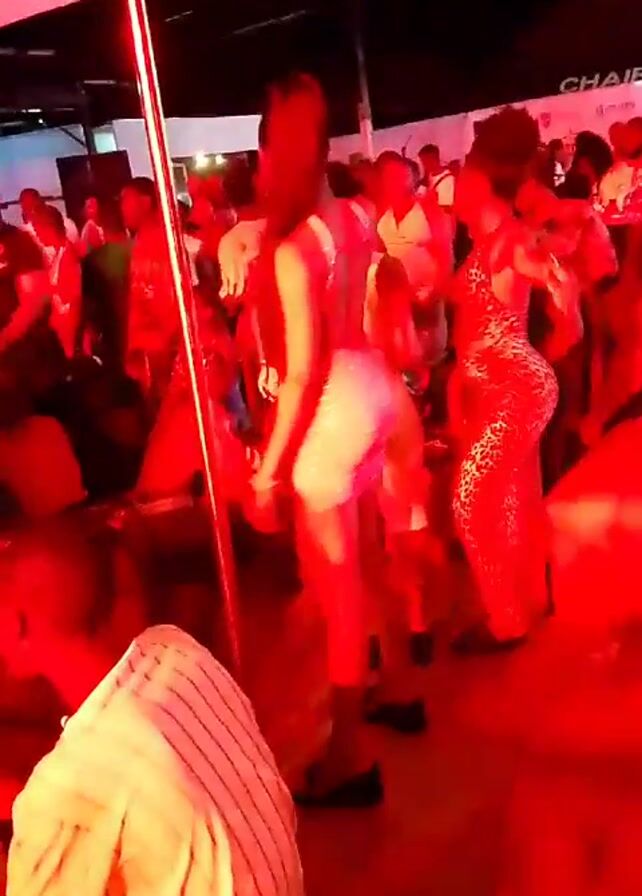 group of people dancing at a party. The room is lit with red lights, and there is a dance pole in the middle of the floor. One woman in a sparkly dress is dancing near the pole, while others move freely around the room. Some of the partygoers are dressed in animal print. The room is crowded, and the atmosphere is festive.