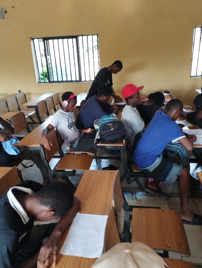 A classroom scene shows students seated at desks. One student rests their head down, while others are writing or engaged in conversation. A student wearing headphones sits near a window with bars. Another student is standing, possibly assisting or observing others. The room is painted yellow, and light streams in from the window. The desks are wooden and appear aged.