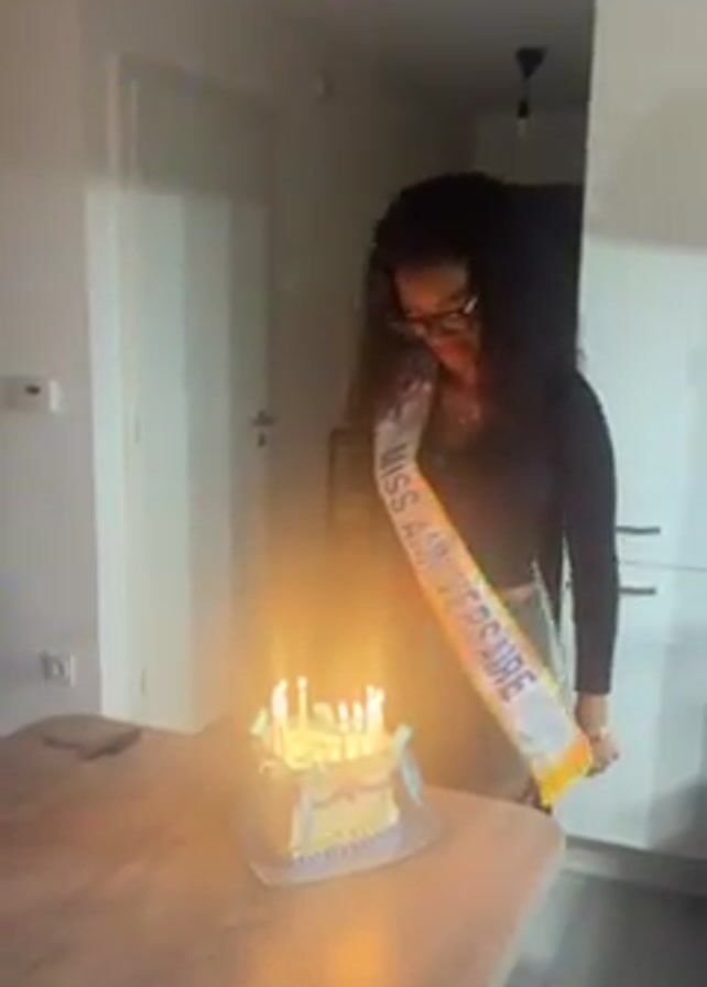 In a brightly lit room, a young woman wearing glasses and a sash that reads "MISS ANNIVERSAIRE" stands behind a wooden table. On the table, there is a small birthday cake with lit candles. The woman looks at the cake and blows out the candles. She is smiling. The room appears to be a kitchen or dining area, with white cabinets and doors visible in the background. There is also a flash of purple light and a few bubbles visible on the left side of the frame.