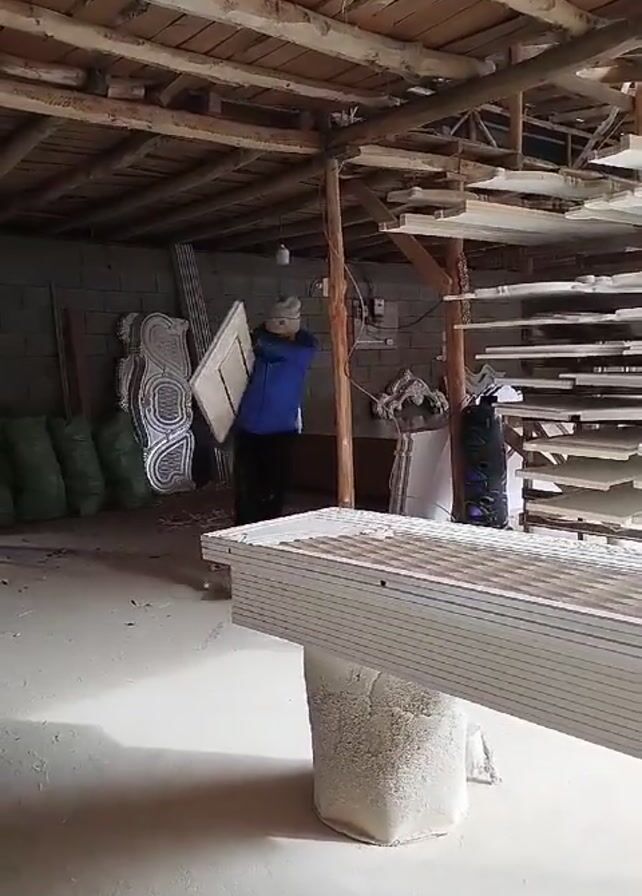 A person is carrying a large board in what appears to be a workshop or warehouse