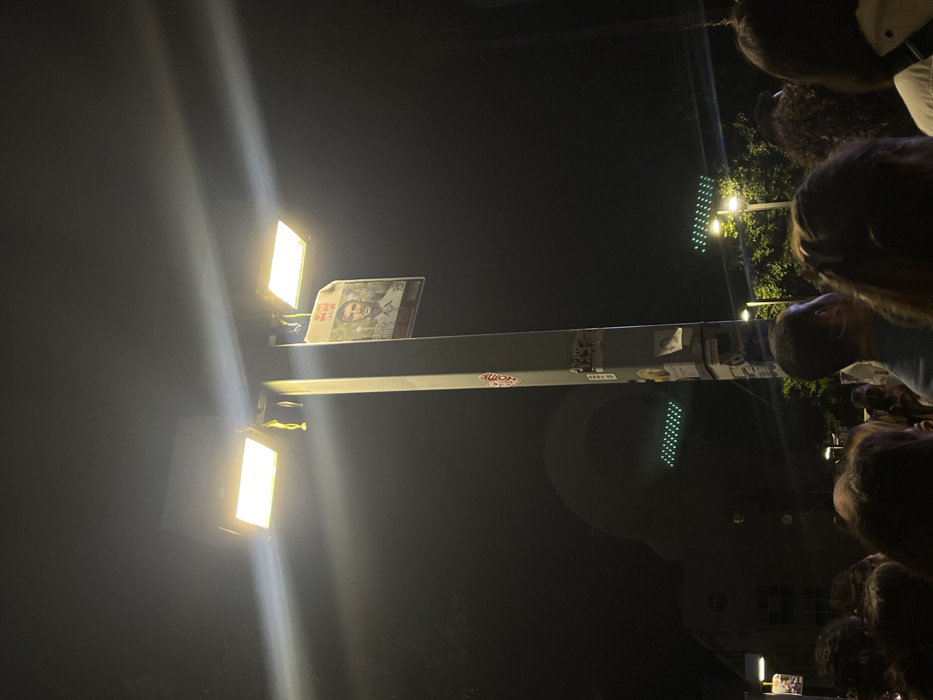 The image captures a nighttime urban scene, likely a public gathering, in Rabin Square, Tel Aviv, Israel. A prominent, tall, grey lamppost stands centrally, equipped with two bright, rectangular overhead lights that emit significant glare. Attached to the lamppost, beneath the lights, is a "Bring Them Home Now" poster featuring a bearded man, identified in Hebrew as "אליאור ברמלי" (Elior Barmeli), with the text "הם יחזרו" (They will return) above his image. The lamppost is also covered with numerous stickers. In the background, dark buildings are partially visible, and several green grid-like LED displays, consistent with public installations or traffic signals, punctuate the darkness. The foreground is filled with the heads and shoulders of a dense crowd of people, mostly seen from behind, indicating a large assembly or event.