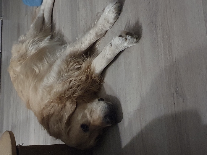 - "A golden retriever sprawls on a gray wood-grain floor" by FM-HsUWg2, licensed under CC BY 4.0