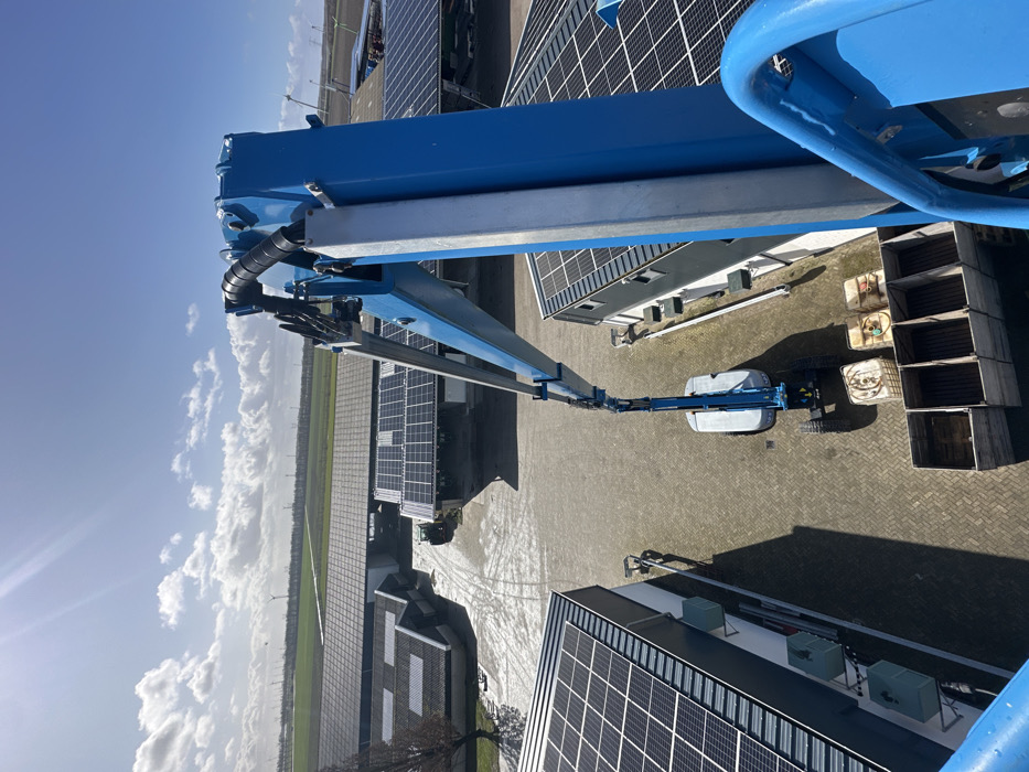 An elevated perspective captures an industrial or agricultural complex under a partly cloudy sky with bright sunlight, consistent with the outskirts of Lelystad, Netherlands. The immediate foreground shows the blue metal structure and railing of an aerial work platform. Extending downwards from the viewpoint is the articulated boom arm of a blue and white self-propelled boom lift. Directly beneath this lift, on a light-colored paved surface, are six wooden crates, four of which are empty or contain dark objects, and three white/yellow intermediate bulk containers (IBCs) or similar industrial containers. The paved area is surrounded by multiple single-story buildings with dark roofs. Several of these buildings, including one large structure in the central background and another in the left foreground, have their roofs extensively covered with solar panels. Tire tracks are visible on the paved ground. Beyond the buildings and paved areas, flat green fields extend to the horizon. A line of numerous large wind turbines is visible across these fields, indicating a wind farm. No individuals are visible in the scene. The sun is high in the sky, casting distinct shadows.