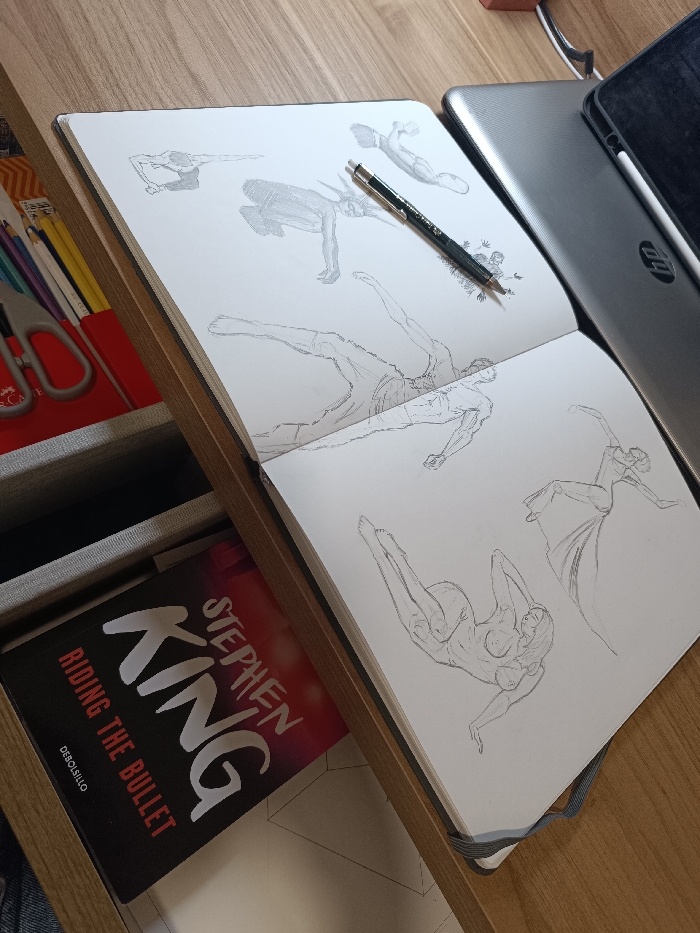 The scene depicts a desk setup in Sabadell, Spain, observed from an elevated perspective. Centrally positioned on a light-colored wooden surface is an open sketchbook displaying multiple pencil figure studies. The left page contains three distinct sketches: a figure leaning forward from the waist, a crouched stylized figure with defined features, and a supine figure with raised legs. The right page exhibits three additional sketches: a figure in a dynamic running or lunging pose, a detailed figure lying on its side, and a draped figure in a dance-like posture. A black mechanical pencil rests diagonally across the spine of the open sketchbook. To the right of the sketchbook, a silver HP laptop is partially visible, oriented with its lid closed. A white stylus is positioned alongside the laptop. To the left, a partially open wooden drawer reveals its contents. On an upper internal shelf, assorted colored pencils and a pair of silver-bladed scissors with red handles are arranged. The lower section of the drawer contains a book with a dark cover, featuring the title "STEPHEN KING RIDING THE BULLET" in white letters over a red-to-black gradient, published by "DEBOLSILLO". The drawer interior shows a textured lining. The surrounding environment is characterized by the light wood grain of the desk, and a subtle geometric pattern is visible on the surface within the drawer.