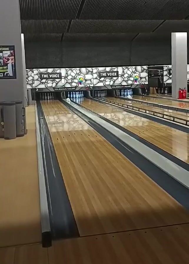 bowling ball rolling down a lane toward bowling pins. The bowling alley is a brightly lit indoor area. The lane is made of wood and has guides on either side. There are pins at the end of the lane, illuminated by overhead lights. At the back of the bowling alley the screen displays "THE VOICE." The ball strikes the pins, scattering them.