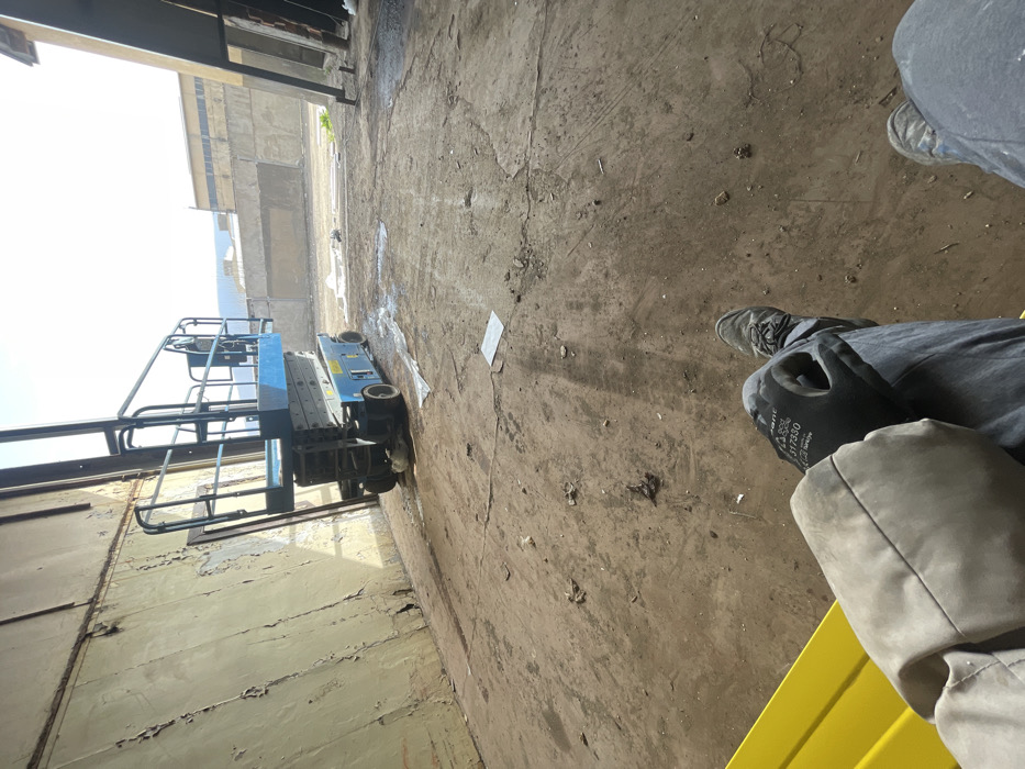 The image depicts an industrial or construction environment, presumably in Montana, Bulgaria, observed from a seated, first-person perspective. The foreground shows the observer's legs, dressed in blue jeans and dark work shoes. A light-colored sleeve or garment rests on the left leg, which also features a black kneepad or work glove with a finger opening, partially obscuring the text "Pent" or "Vent" and "317530 Hardy." The observer is positioned on a yellow object, partially visible in the lower left. The midground consists of an uneven, dirt-covered ground with scattered debris, including small rocks and paper. A blue and black scissor lift, with its platform in a lowered position, is parked to the left of the center. Sunlight casts distinct shadows across the ground. The background features a tall, light-colored wall with extensively peeling paint on the left, indicating the interior of a large structure. To the right, a dark vertical structural element suggests an open bay. Beyond this structure, an unpaved outdoor yard extends under a bright sky, with distant industrial-style buildings or concrete walls and faint hills visible on the horizon. No other individuals are present, and no actions are in progress.