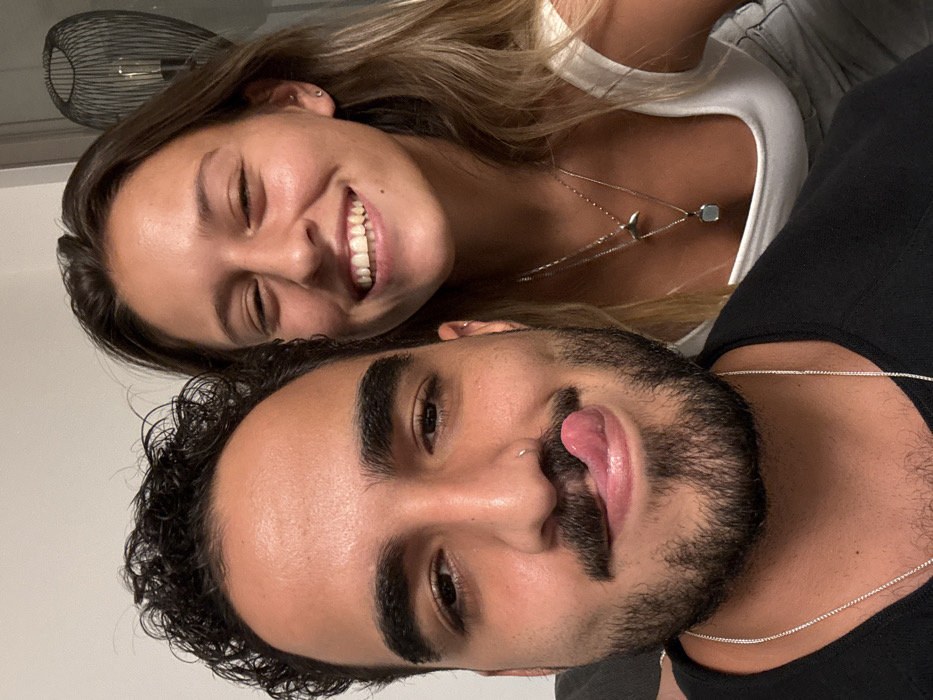 The image displays two young adults, a male and a female, in a close-up indoor selfie