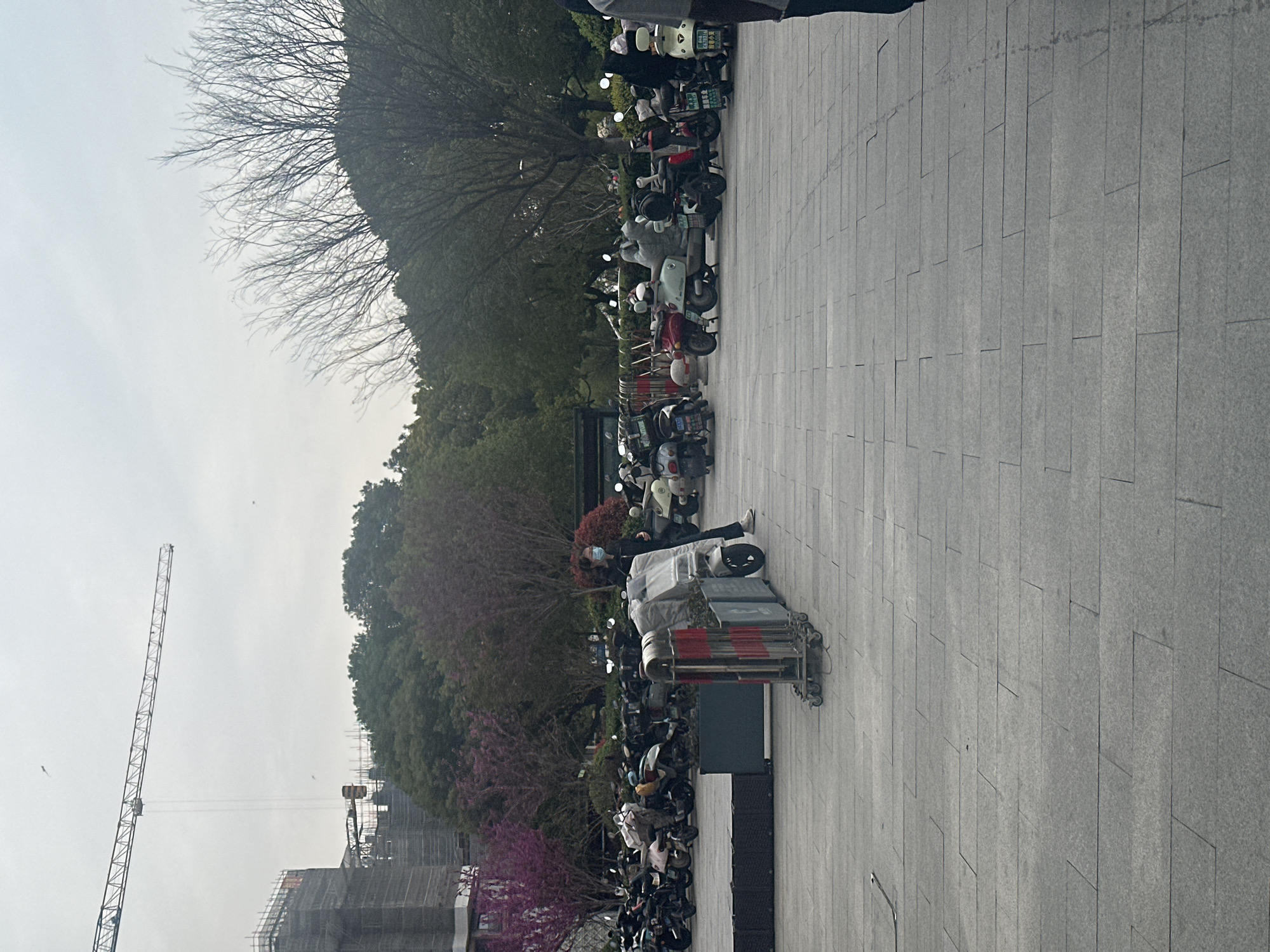 This image depicts an outdoor scene in Jiangning District, China, under an overcast, light grey sky. The foreground and midground consist of a wide, paved area constructed from rectangular grey stone pavers. In the mid-left, a series of dark, low, modular barriers or planters are arranged horizontally, with a wheeled metal barrier featuring diagonal red and white stripes positioned next to them. Beyond these barriers, a dense parking area holds numerous electric scooters and mopeds. These vehicles, appearing in various colors including white, red, light blue, and black, are tightly clustered in rows; several are covered with grey tarps or plastic sheeting, and some are equipped with rear storage boxes. One individual is visible in the mid-left, standing near a tarp-covered scooter and the red and white barrier. This person wears dark clothing and a light blue surgical mask. A partial view of a second person's lower body is present at the extreme right edge of the frame. The background features a line of trees with varied foliage; some trees have bare branches, others display dark green leaves, and several exhibit bright pink or purple blossoms. To the far left, a multi-story building under construction is partially visible, covered by dark scaffolding netting. A large tower crane with a long horizontal jib extends across the upper-left portion of the sky, positioned above the construction site.