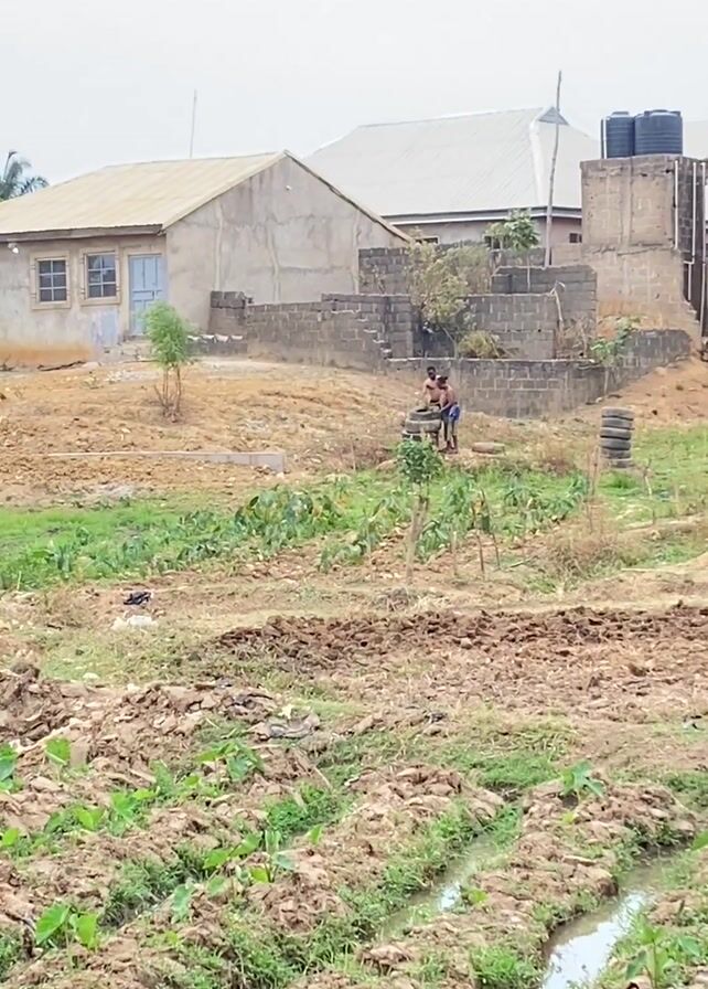field in a residential area. The field has rows of plants with a small stream running through it. In the background, there are several houses in various states of construction. Initially, two figures are seen near some cinder blocks. They then move to the field where it is revealed they are adults using manual tools to work the field. One individual is wearing a white shirt and the other is wearing a green shirt.