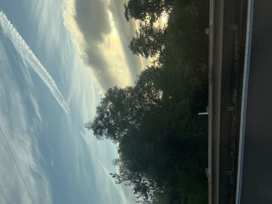 A landscape depicts contrails streaking across a blue sky with wispy clouds. The sun shines behind a heavy, grey cloud formation. Dark green foliage of trees occupies the right side of the image, partially obscuring the sun. A metal guardrail and asphalt road edge are visible on the right, suggesting the image was taken from a moving vehicle.