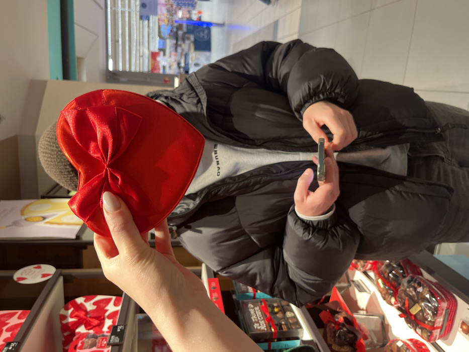 A person holds a heart-shaped, red box with a satin bow in their left hand. In the background, another person is wearing a dark jacket over a grey shirt and holding a cell phone. Boxes of chocolates are visible below. A shop interior is suggested in the background, as well as a counter. The photo seems to be taken at an angle.