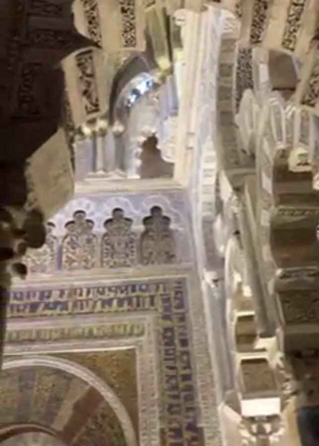 The camera looks upwards in what appears to be a very old building with intricate architectural details. Elaborate arches and pillars with ornate carvings and patterns dominate the scene. The walls are decorated with mosaic-like designs featuring geometric patterns and Arabic script. Some scaffolding is visible in the background, suggesting that the building is undergoing renovation or maintenance. The lighting is soft, highlighting the texture of the stone and the craftsmanship of the carvings. The overall impression is one of historical grandeur and meticulous artistry.