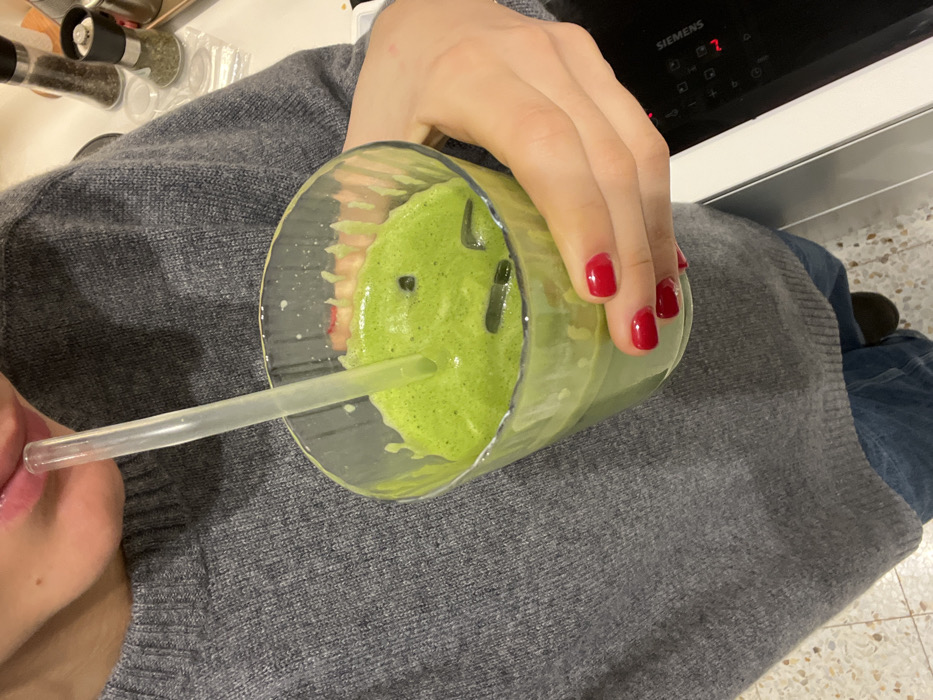 - "The image displays a close-up, downward-angled view of an individual holding and drinking a bright green, frothy beverage through a clear straw" by FM-t80Kg1, licensed under CC BY 4.0